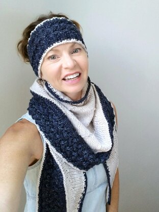 Graceful Willow trees offer safe refuge for many creatures, such as birds, butterflies, and viceroy. The stitch patterns in both headband and shawl represents creatures flying to the Willow tree for safety from predators.