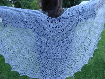 Knit from the top down, the edging is knitted as part of the shawl body, so there's no sewing or 'knitting on' the edging horizontally after the shawl is done - for either version. The neckline design signifies trees where the great owl is perched by day. The next section is the yoke that shows the owl in flight by night with its wings gradually spreading open wider. The shawl body begins with the neck feathers, then the long flight feathers, finishing with an optional ruffle edging that portrays the wing tips that undulate in the wind. Alternatively you can choose to do the f