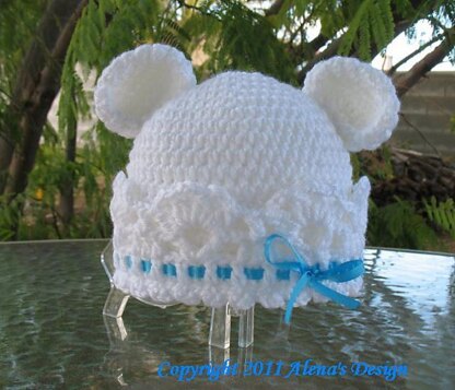 What a beautiful Bear! Crocheted bear ears and lace brim make this hat look cute and adorable. Can you just imagine how your child will be looking in this White Bear Hat, and how many compliments and memorable pictures you will have as keepsakes? Includes five sizes: