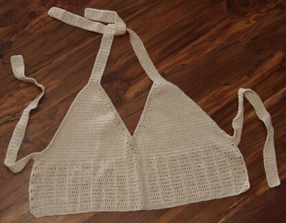 A row of stitches across the midriff is made first and then the cups with straps are individually crocheted onto the row. The midriff is then worked on the opposite side of the starting row. Once the midriff is finished, side ties and the center trim are worked. Then, the entire halter is edged in single crochet stitches.