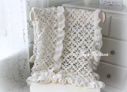 This is a pattern for a baby blanket (afghan, christening shawl) in lace spider stitch design and a wide ruffled trim made with light worsted (category 3) yarn and size G/6 (4.25 mm) crochet hook. The finished blanket measures approximately 40 by 31 inches. The skill level is beginner. This pattern can easily be adjusted to a bigger or smaller size; the multiple is included in the pattern. The pattern is written in English, using the US crochet terminology. This pattern is my original design and it cannot be redistributed. However, you have the permission to sell finished items made from this pattern.