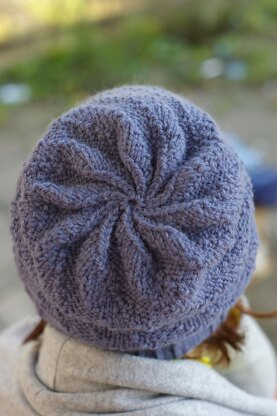 Simple hat with lovely swirly crown. It knits up nicely and quickly with an easily memorized pattern repeat. And the reverse side looks great too.