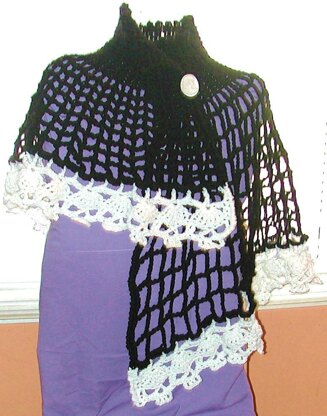 Asymmetrical Capelet With a skull Border. Directions include how to make it one length. I used most one full skein of Red Heart Super Saver for the body, and about 1/4 of a skein for the border. To make the cape one long length, I would allow 2 skeins for the body, and 1 for the border. Finished measurements : Short front side measures 13 inches before border, 17 inches with border. Long front measures 24 inches before, and 18 inches after. Bottom width is 102 inches