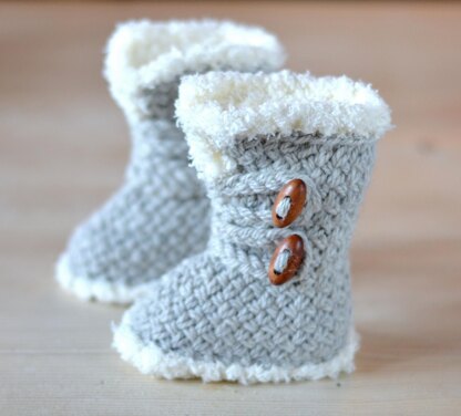 Knitting Pattern for Ugg Style Baby Boots in beautiful Basket Weave Stitch with Fake Fur trim. Cozy and warm, these booties are unique, and perfect for winter fun! They have an opening at the front so are easy to slip off and on. They fasten with two little wooden toggles around the front of the ankle, so completely kick-off proof - these will definitely stay on baby's foot!