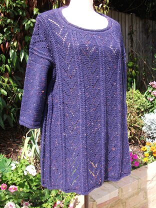 The back and front of this tunic consist of simple lace panels worked over 16 sts, with all wrong side rows in plain knitting. The panels are interspaced with really easy raised slip stitch twists which gives a flattering vertical line to the design. The 3/4 sleeves and neckband have the lovely detail of a rasied reverse stocking stitch border.