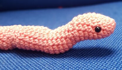 This is my nice little friend Wiggle worm. He/she (worms are hermaphrodite – that means they are both he and she) has the wiggles built in. I made Wiggle because I finally worked out a good way to put permanent curves into tube shapes, rather than sharp bends (as I use for knees and elbows) or cheating by putting wire/pipecleaners inside to shape tails and so forth. Also I had just the right colour for a worm! Anyhow, there are wiggles in the body and the head stands up from the rest, which is what I wanted, and all you need is to increase and decrease in the right places.