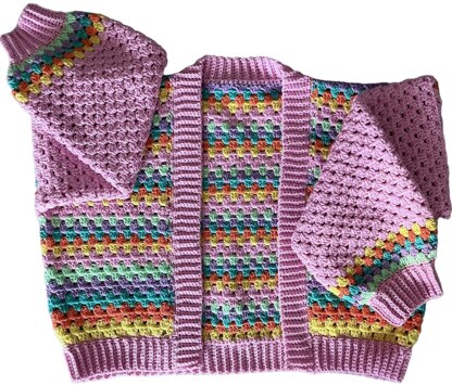 WELCOME to my pattern info for The “Wild as Daisies” cardigan was named for its versatility in the process of creating a ‘Made To Measure’ Cardigan using up all of your Yarn Scraps. It is an ‘Advanced Beginner’ pattern – A unique, fun garment, created using “Granny Stitch Clusters” . It offers the flexibility to use any “Yarn weight” -“Hook Size” or “Colour combos” you desire - Allowing for customisation in width/length and size. The construction consists of 3 Panels pieced together – then the sleeves crocheted out from the garment – with Ribbing for neck/fronts, cuffs and bottom edge last. 9 sizes - XS S M L XL 2XL 3XL 4XL 5L