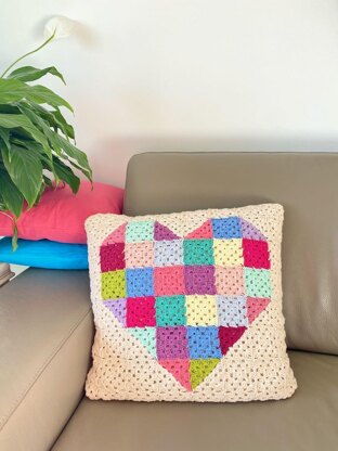 The cushion front is made of colourful little granny squares, forming a heart together.