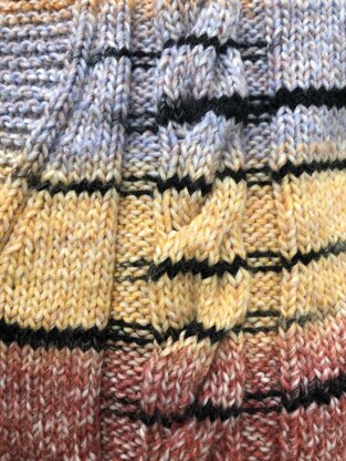 A striking but cosy cardigan with one large cable on each front and two on the back - all set on a stocking stitch background. The shaped front borders are knitted in garter stitch and worked in one with the fronts. Sleeves are in stocking stitch with ribbed cuffs. The design and yarn choice (lots of colour variations available on LoveCrafts) will give you a modern and sassy look - suitable for all ages. Worked bottom up and with full written instructions.