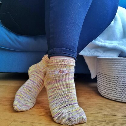 These cute socks were inspired primarily by the main yarn. The colour feels like Spring to me and so I wanted a fun colourwork panel to represent that. I chose a sweet little floral motif worked in a contrasting colour. Have fun playing around with your colours; choose a subtle or stark contrast for your colourwork.