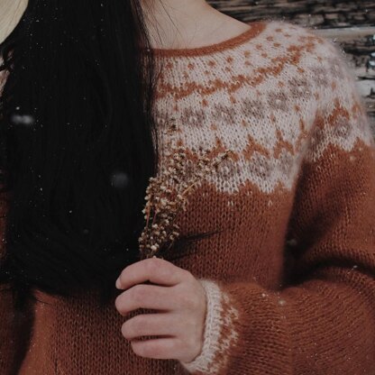 This top-down jumper is knitted in the round and features a seamless construction and colourwork yoke. It comes in seventeen inclusive sizes to fit all body types and shapes.