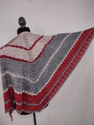 Wildflower is a triangular shawl. Recommend solid or tonal colors. Original design knit up using 3 colors in Urth “16 Fingering”, 1 skein in color #308 (taupe) used 40 grams; 2 skeins color #302 (red), used 77 grams; and 2 skeins color #303 (grey), used 93 grams. Total of 1100 yards/1000m, 250grams, on a Size US 5 needle. Please do gauge to insure shawl size and adequate yarn amount, or purchase additional yarn.