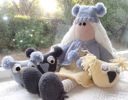 She is knitted in 8Ply/Dk wool on 3mm needles (UK 11). She is knitted flat and then sewn together.