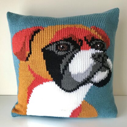 Knitted cushion cover featuring a Boxer Dog in a fun pop art style!