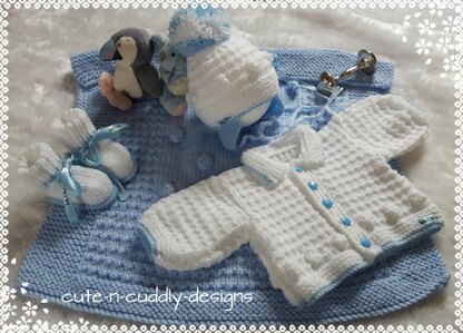 The pattern consists of a jacket, hat with pom pom, bootees and a car seat blanket