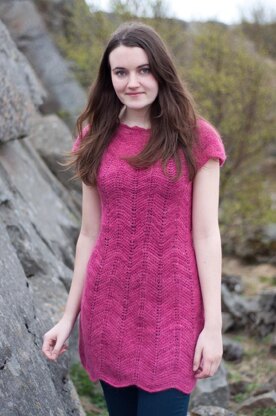 This is a sleeve-less, lace-patterned coctail dress crocheted top-down in the round. It is not a pattern for a beginner, but still not as tricky as you might think.