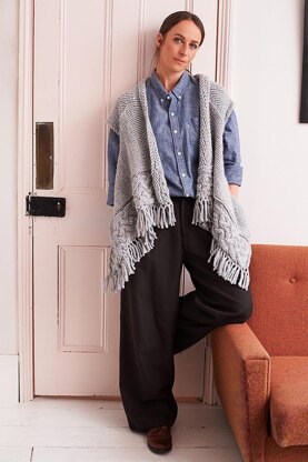 Wiltshire Wrap is designed to be a blanket you can wear. The little capped sleeves turn an otherwise simple wrap into a wearable garment. Wrap yourself up in the thick fabric and style it with a shawl pin and you will be as snug as a bug in a rug! Knitting and creating the fringe at the same time as the garment eliminates the need for joining yarn ends and the fun knots add a polished finish to a cosy knit. The wrap is knitted back and forth but uses circular needles due to the number of stitches and the weight of the yarn.