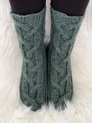 Construction: These socks are worked top-down, with a flap-and-gusset heel and a classic wedge toe. Knitters may use their preferred sock needles; directions are made in reference to markers used for the beginning of the round and the cable panel rather than specific needles. The cable panel is both written and charted.