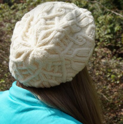 This hat was originally designed and knit as my TKGA Master Knitter level 3 hat project. The brim is knit side-to-side, with stitches picked up to then knit the body in the round. Cables move up the hat to intertwine at the crown. The hat is designed to fit in a slouchy beret style.