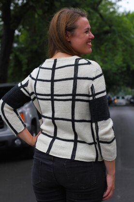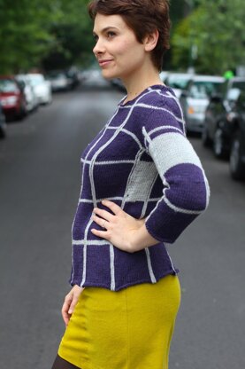 This fabulous and warm sweater will make you stand out among your friends. It has big windowpane checks, filled in just where you need to look a little slimmer or where you might lean on a table and not want it to smudge! The big checks make it really fashionable and graphic. It has clever details like a provisional CO for a smooth edge, contiguous shoulder shaping, invisible neck bands, 'curved' sleeves for a quirky fashion twist and still remains comfortable and easy to wear.