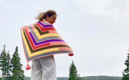 Inspired by sailing (wing-and-wing is when you are sailing downwind with the foresail out on one side of the mast and the mainsail out on the other) WING-and-WING is traditional triangle shawl with stunning colorful stripes! It is a colorful and easy knit, working simple intarsia (only working 2 colors at a time) to stunning results. And the finishing, with I-cord edging all around and an optional tassel at the shawl's bottom point, are exquisite. WING-and-WING is big to wrap yourself up in and a colorful addition to the back of a chair or couch.