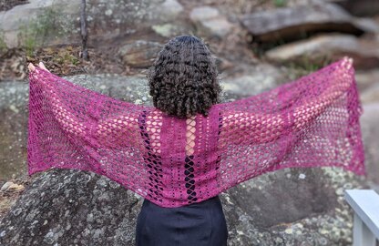 You could easily scale it up with heavier yarn and a bigger hook to make a bulkier, thicker shawl/scarf for winter. I have developed a version for 4-ply (fingering) called flight of Fancy.