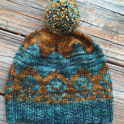 Yarn: Malabrigo Rios (worsted weight/ 210 yards (192 meters)/ 100g skein) 1 Skein each in Azul Profundo (MC) & Sunset (CC). Uses just under ½ sk/each before pom pon.