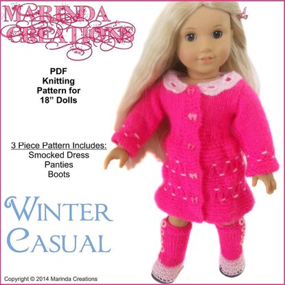 This is one of my own designs designed to fit American Girl Doll and other 18'' soft bodied dolls. The pattern includes a long sleeve dress , panties and boots .