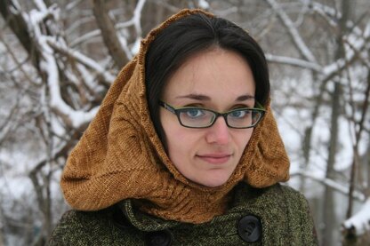 Part cowl part hood, Winter Coronet keeps you warm while outside in the winter. Worn up, the beautiful interwoven cables are snug around your ears, acting as graceful earwarmers while also keeping the wind from sneaking down your neck. Worn down, the hood adds plenty of extra fabric around your neck and shoulders; much appreciated when the temperatures drop!