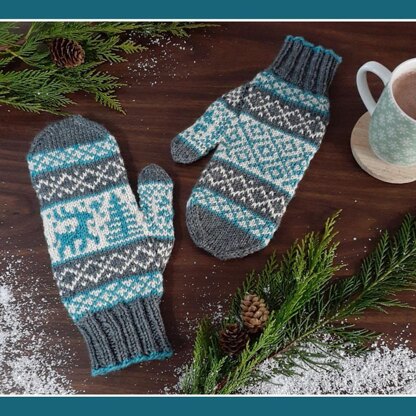 Featuring a winter deer scene amid diamond motifs, these mittens are fun to knit and will keep your hands toasty warm.