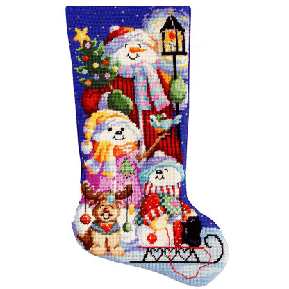 By Linda Gillum. Our cheerful snow family is glowing in the light of a candlelit lantern on a cold dark winters evening. This stocking will bring the joy of the season into your home. Proud parents and their little one on a sled make for a fun scene by designer Linda Gillum that will be a cherished heirloom stocking for generations to come.