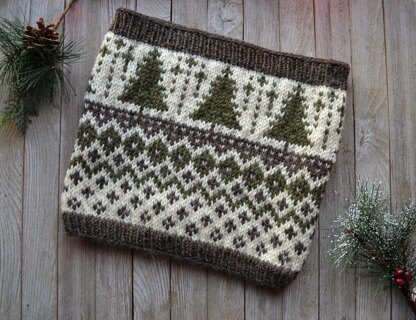 The Winter Pine Cowl is a fair isle project worked in the round. The final fit of this cowl should be tall and have a good drape.