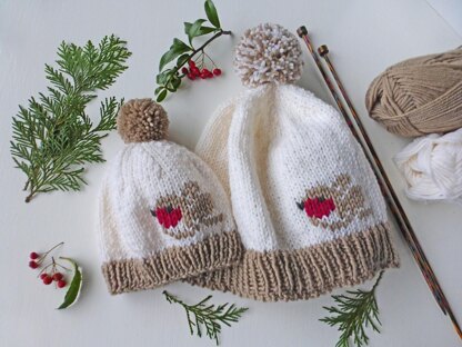 This robin themed hat has a ribbed welt and a stocking stitch body with a little flying robin motif Swiss Darned (duplicate stitched) on to the lower section of the hat body. The hats pictured are worked using a lovely soft pure wool yarn in worsted weight and are topped with an optional pompom.