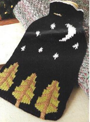 This is a pattern for a winter scenes hot water bottle cover, originally published in Knitting magazine. It is in stocking stitch with intarsia motifs, houses on one side and trees on the other, with added embroidery. 2 x 2 rib border. Photos Knitting magazine.