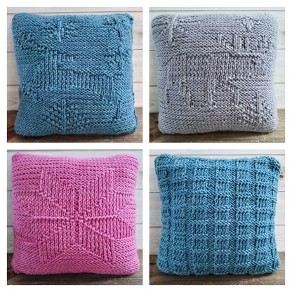 Winter Shadows is a collection of four charts, all worked flat, using knit stitches on a purl stitch background to hint at subtle winter themed motifs. The first three charts are based on well-loved Scandinavian folk patterns, while the fourth chart is a simple grid that can be used for each of the pillow backs. But, of course, there are no rules!