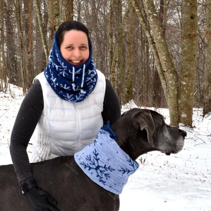 Winter Showers brings Snow Showers cowl and Winter Chic snood together in one pattern. Sized for humans, the Snow Showers cover is modeled by our “Great Dane in Charge of Spreading Joy,” Puddles. Like snowflakes that intwine and swirl as they fall from the sky, with enough yarn in hand, the version won’t land on your stitches until Rnd 51.
