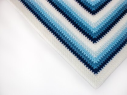 A flat, dense stitch consisting of a single crochet and a chain one. Worked in the round much like a granny, but the short stitches make it perfect for lots of color changes. An advanced beginner crochet blanket in a gorgeous repeat of cool crisp white and blues make up this warm blanket!