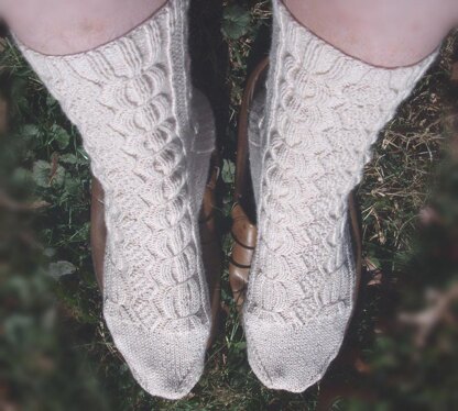The negative ease of this stitch pattern makes it a perfect choice for cotton based sock yarns, but may not have enough elasticity for those who need a wider leg. Therefore, directions are also provided for a wider cuff. Any medium weight sock yarn will work; solid or semi-solid yarns in “wheat” colors are suggested. Directions for a fitted heel and simple arch shaping are provided along with directions for increasing the width of the cuff.