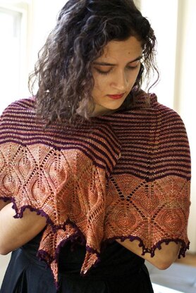 Designed for the Winter 2013 issue of Ply Magazine, this shawl works up beautifully in 750 yards of light fingering weight handspun. The stockinette stitch body shows off your lovely handspun yarn, while the lacey border gives the shawl a delicate touch. The bottom edge is finished with a picot bind off.