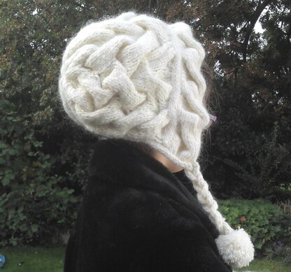 On a cold, crisp winter’s day I love nothing more than wrapping up in soft, warm knitwear. This hood was inspired by my love of cosy warmth, but also my longing during winter’s long dreary days for a touch of whimsy and romance. This heavily cabled hood is snug and warm, whilst also adding a Winter Wonderland feel to an everyday need to keep warm. The hood features a chunky 14 stitch cables on a ground of stocking stitch that creates a great deal of texture, almost bringing the stitches of the fabric over on top of themselves, this adds a great deal of textural interest and is much easier to achieve than might be imagined.