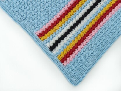 An advanced beginner crochet blanket with a cluster stitch consisting of double crochet, chain one and single crochet. Works up quick and has a nice soft squishy texture when complete! Featuring Caron Simply Soft with contrasts of soft blue and pink, red, gold and black make up a nontraditional winter color palette!