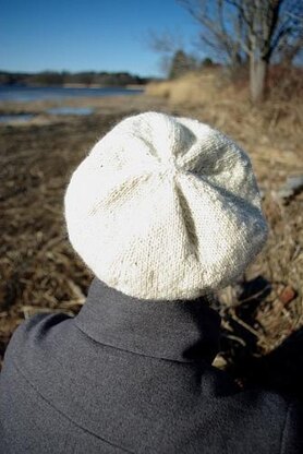 A beret and glove set featuring cables and bobbles. The elbow-length gloves are fitted through the arm and the beret features a complimentary cable pattern.