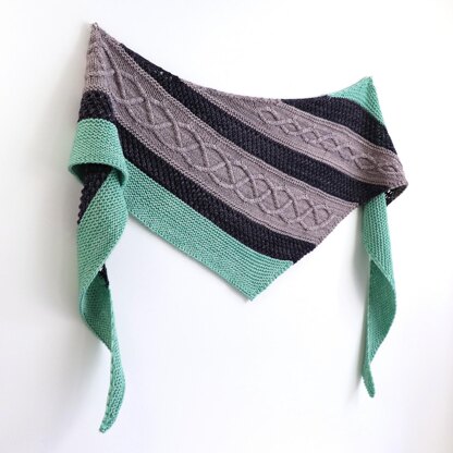 The triangular shawl features block stripes with alternating texture and color for versatile knitting fun: Garter stitch for a rhythmic and soothing knit, eyelet galore creating an airy mesh to frame the horizontal cables which offer just the right challenge to keep the knitter engaged. Using only 250 g of worsted weight yarn, the shawl knits up in no time to make a quick transition from your needles to your wardrobe.