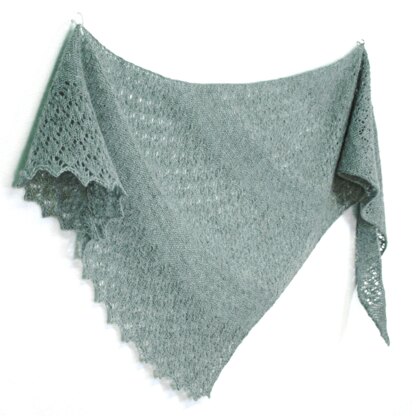 The shawl is framed by built-in i-cord edges and finished with an elastic bind-off, blocked into a scalloped edge. The pattern for Wintermint Shawl comes in two sizes.