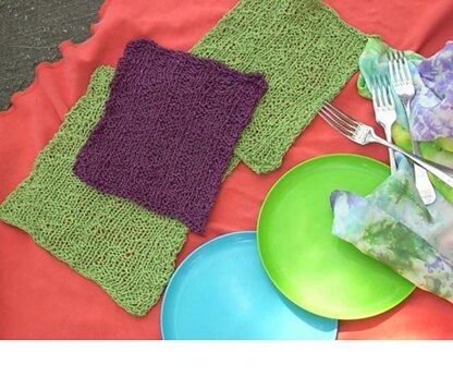 Wipe is a napkin, a dishcloth, or whatever you need it to be in the moment! It’s the perfect picnic companion, and it’s even useful to pick up a hot dish while camping. The reversible textured knit/purl pattern adds paisley shapes that appear as you knit. The samples use 2 skeins of DK weight Allhemp 6, hemp for knitting, with contrasting colors, but you can use approximately 200 yards (183 meters) of whatever DK weight yarn suits your needs. The sizing is flexible.
