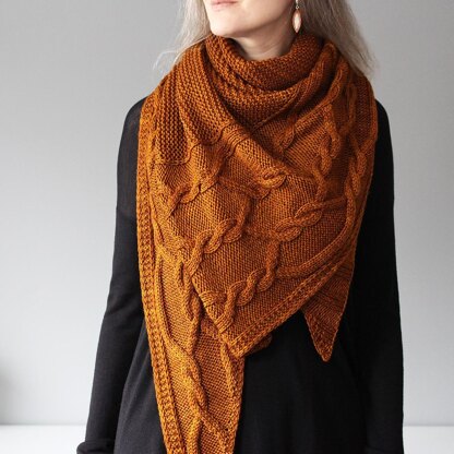 A beautiful motif with intertwining cables, that remind me of the cleverly communicating roots of the trees, creates an eye-catching wide border on this cozy triangular shawl.
