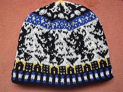 The beanie has at most two colors in one round. So it's easier to knit than you may think! It has a three color ribbing, followed the city (houses) at night below , then comes the witch on her broom with the cat at her back. She is surrounded by some bats and ravens. Then comes the starry sky and the full moon with some clouds above. The crown is made of tiny sitting black cats looking over their shoulder, forming a beautiful star at the top!