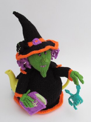 The Witches Brew Tea Cosy is a witch and about her she has frogs, a cat, a spider on her hat and a book of spells, everything she needs for a witching hour night.