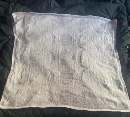Uses 400g of DK wool. Size 4 mm knitting needles. Measures approximately 34 inches by 34 inches. This is a written pattern, no chart.