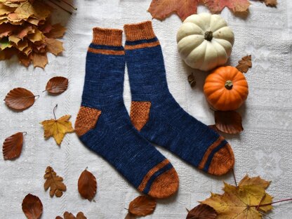 Inspired by world famous wizardry series those comfortable socks designed for children and adults and features contrast toe and cuff sections accompanied with a few contrast stripes in bright in bronze colour on a deep blue background. The socks are knitted from toe to cuff with stronger heel, which is knitted with slipped stitches for longer wearing. Socks knitted on circular needles using magic loop method. Both foot and leg lengths adjustable.